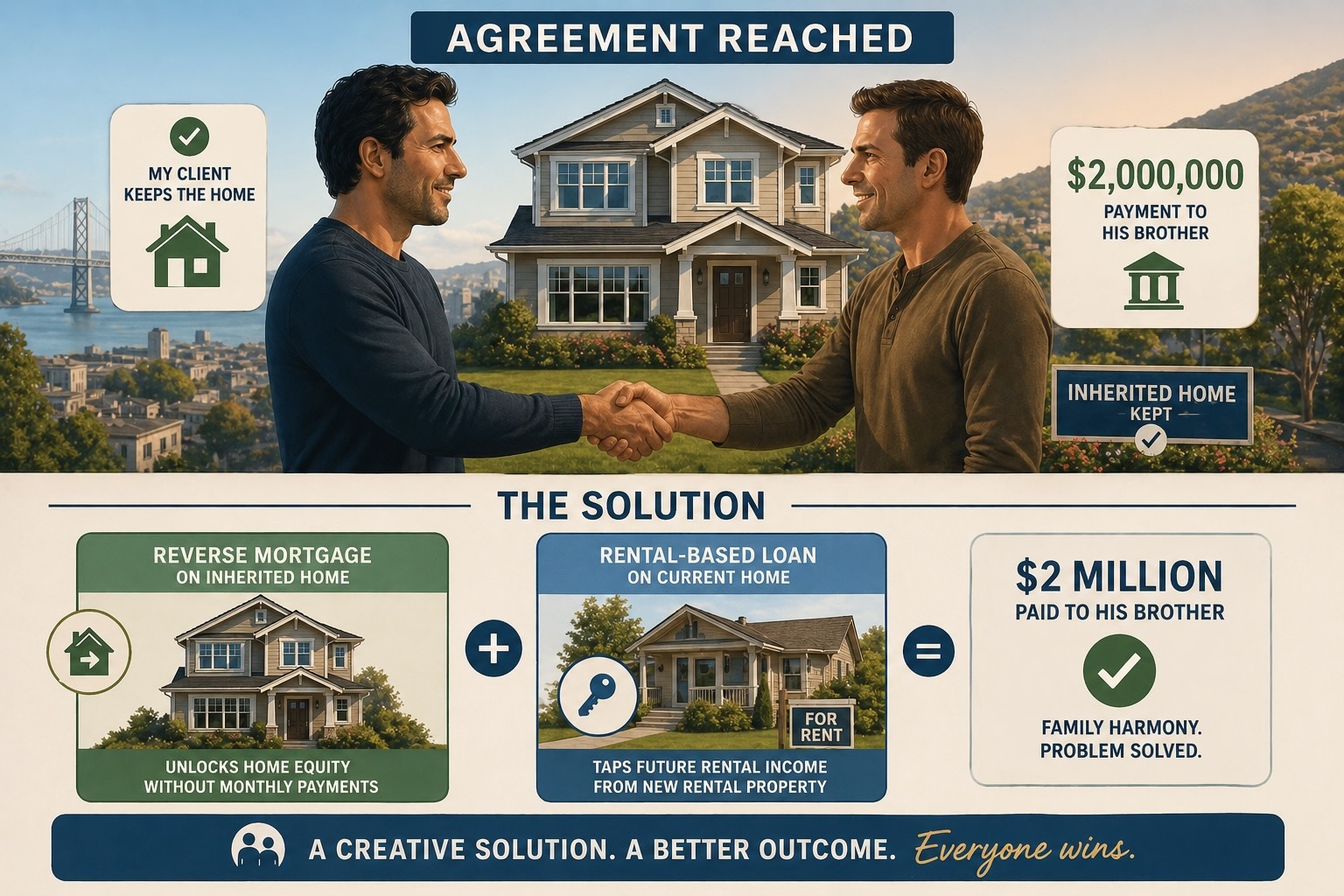 I was able to find a creative solution by combining a reverse mortgage on the inherited home with a rental-based loan on the property where my client currently lives, which will now become a rental property.